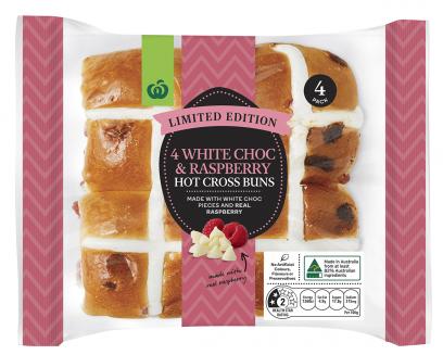 The Woolworths Banana & Caramel Hot Cross Buns are made with decadent caramel pieces and Australian bananas for a creamy, melt-in-your-mouth experience while the Woolworths White Chocolate & Raspberry Hot Cross Bun contains white chocolate chunks and raspberries for a hot cross bun with a sharp, fruity zing.